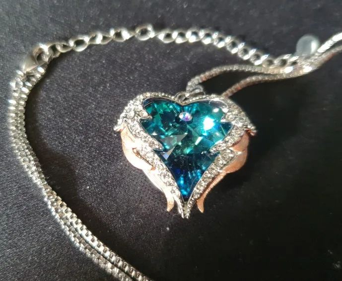 Heart-shaped stunning and shiny crystal wrapped with Platinum Plated angel wings, filled with glitters and sparkles. The dazzling necklace represents the symbol of forever love and the faith of the Guardian. Wear it and enjoy getting showered with compliments.